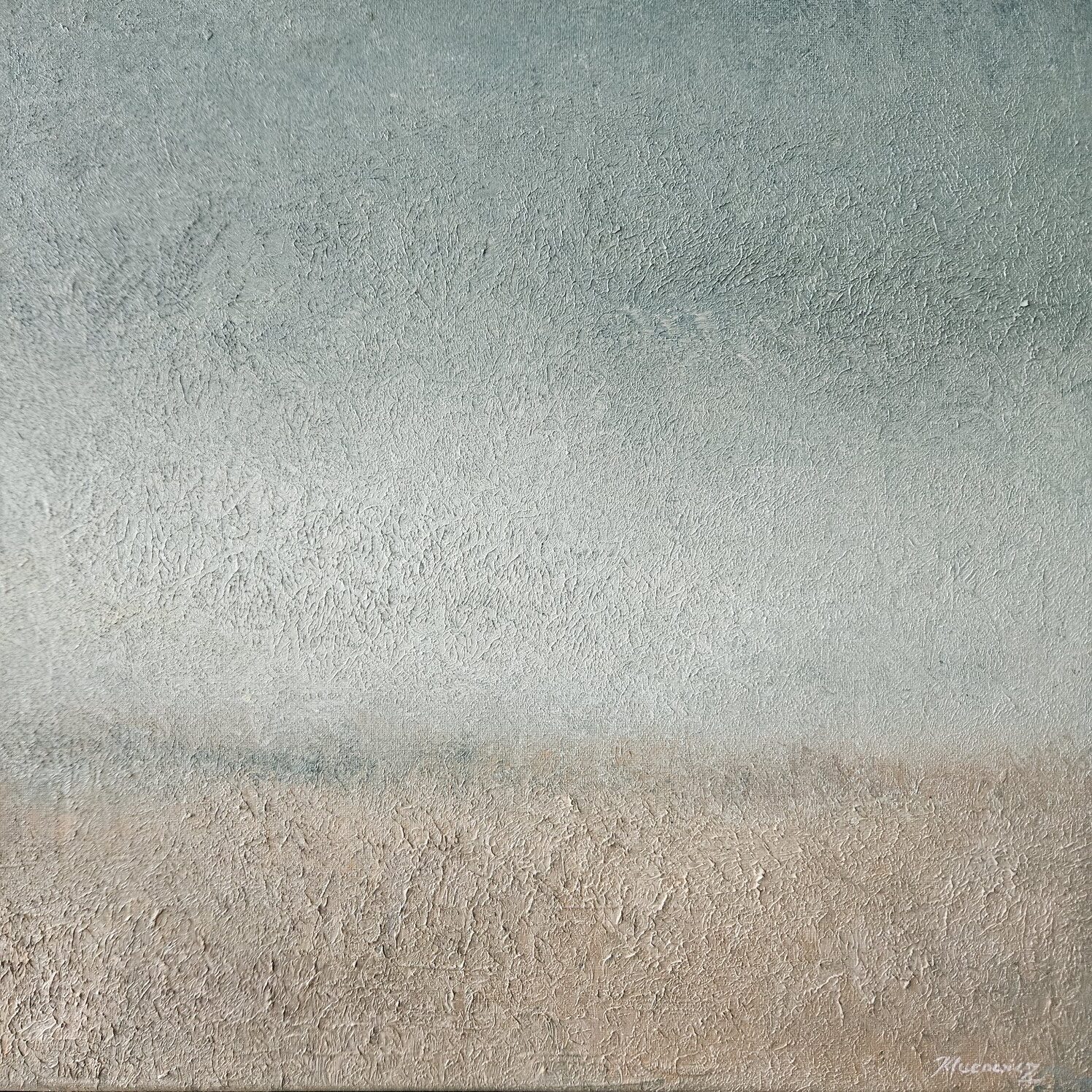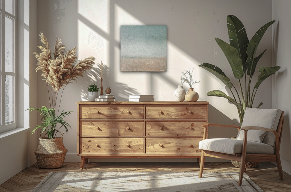 Obraz wspaniale komponuję się z innymi obrazami z serii „pejzaże” w formatach 50×50 cm. Prezentuje w galerii zdjęć, przykład kompozycji składającej się z czterech obrazów obok siebie.