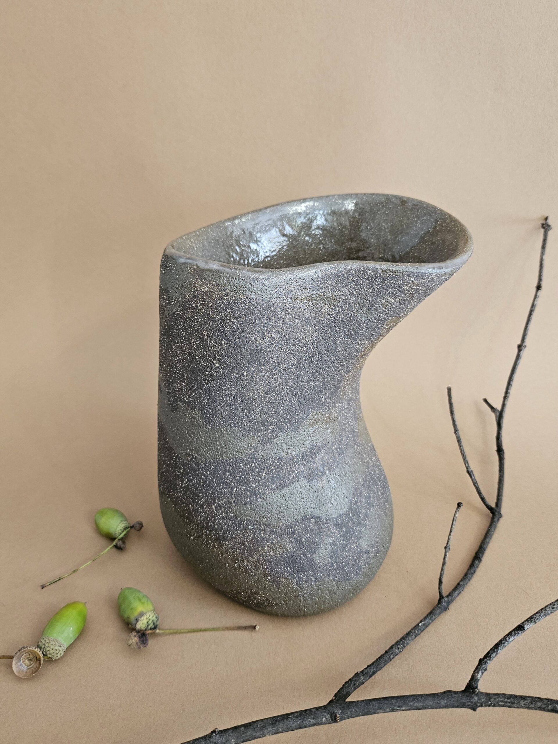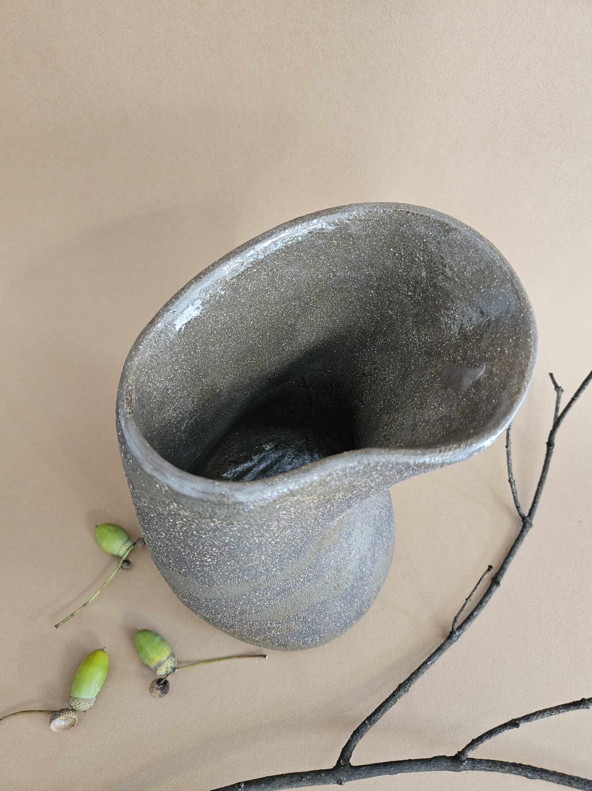 Jest unikatowy, ręcznie tworzony z gliny szamotowej w kolorze ciemnej czekolady połączonej z ciemną oliwką. Pokryty wewnątrz szkliwem bezbarwnym, które kontrastuje z matową surową gliną na zewnątrz.
